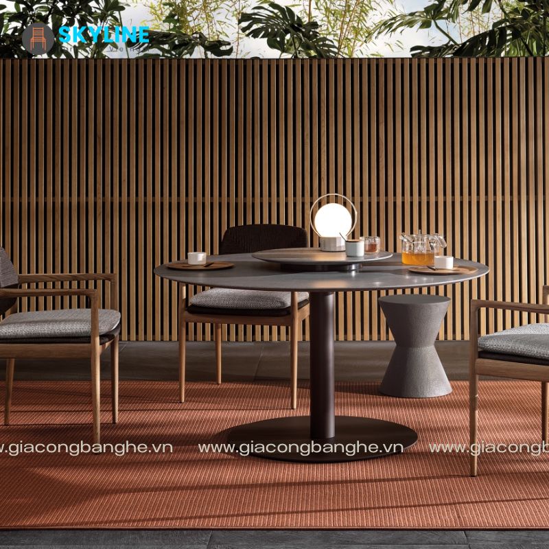 Bàn ăn nhà hàng SKLT032 được làm từ ống thép dày sơn tĩnh điện, mặt bàn đá tự nhiên, gỗ ngoài trời hoặc kính cường lực, bàn ăn SKLT032 có thể sử dụng ngoài trời bởi công năng tuyệt vời từ chất liệu đặc biệt này.