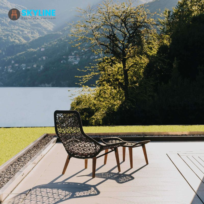 Ghế bành thư giãn ngoài trời SKLC048 của Skyline các yếu tố chỗ ngồi mang nét quyến rũ truyền thống cổ điển được diễn giải lại với một sự rung cảm đương đại. Cấu trúc của ghế bành cao cấp, chân ghế được làm hoàn toàn bằng gỗ Teak chắc chắn, được chế tác thủ công với các kỹ thuật gợi nhớ đến truyền thống chế tạo đủ tốt, sơn PU tự nhiên ngoài trời hoặc lau dầu ngoài trời. Lưng tựa và mê ngồi được làm từ kim loại sơn tĩnh điện hoàn thiện dây đan, chân đế nhựa chống trầy xước sàn.
